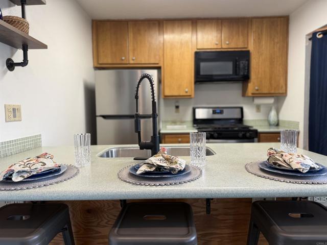 Discover this highly desirable single-level #1 unit nestled in a prime Santee location-just moments from Town Center shopping, popular restaurants, Target, and Costco. Situated on a peaceful cul-de-sac, this home is ideally positioned next to the sparkling community pool and convenient mailboxes. Enjoy the comfort and security of a shared garage with an automatic door, a private locking closet, and built-in storage cabinets. The updated interior features luxury vinyl flooring, a brand-new gas stove, and a sleek stainless steel refrigerator. The kitchen offers solid, full-size cabinets with pull-out shelves, deep double stainless sinks, and a tall pull-down faucet, perfect for any home chef. Additional highlights include forced air AC and heat for year-round comfort. Both conventional and VA financing are welcome in this VA-approved complex. Experience the best value and unbeatable location, don’t miss your chance to make this Santee gem your new home!
